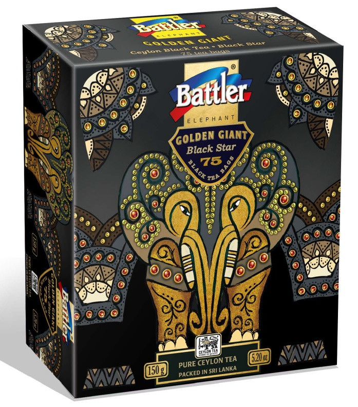 Herbata BATTLER GOLDEN GIANT Black Star to czarna cejlońska herbata liściasta w kartonowym pudełku, ekspresowa, 75 torebek w kartonowym pudełku.