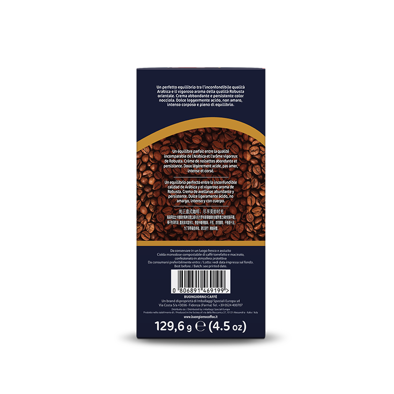 Kawa mielona zapakowana w bibułę o okrągłym kształcie. Idealna do ekspresów kolbowych lub na Pods-y. Idealna równowaga między niepowtarzalną jakością Arabiki a energicznym aromatem orientalnej Robusty. Mieszanka o delikatnym smaku, z nutami mlecznej czekolady, migdałów, tostów, kwiatów i kandyzowanej pomarańczy. Obfita i trwała crema w kolorze orzecha laskowego, nie gorzki, intensywny, pełny i pełen równowagi smak.